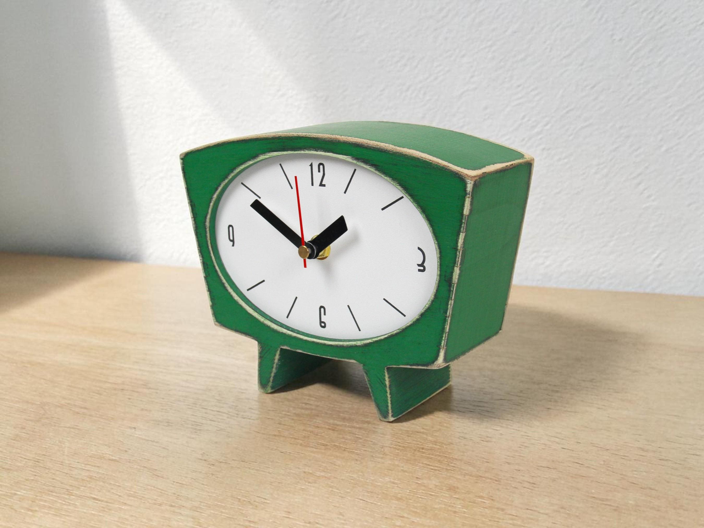 Handmade green wooden desk clock inspired by mid century design. A small decorative piece that adds color, character and a vintage touch to your interior.