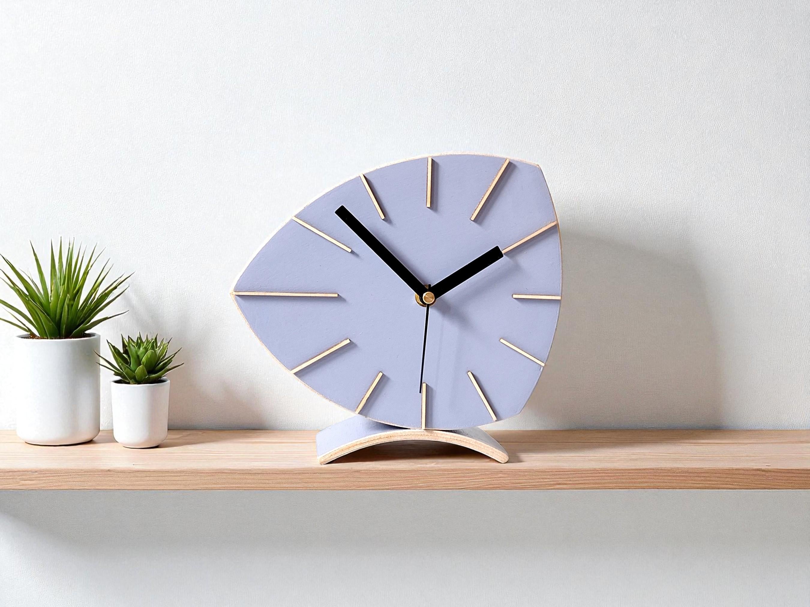 A lavender wooden desk clock with a calm, minimalist presence. Designed to sit naturally within modern, Scandinavian and thoughtfully arranged interiors.