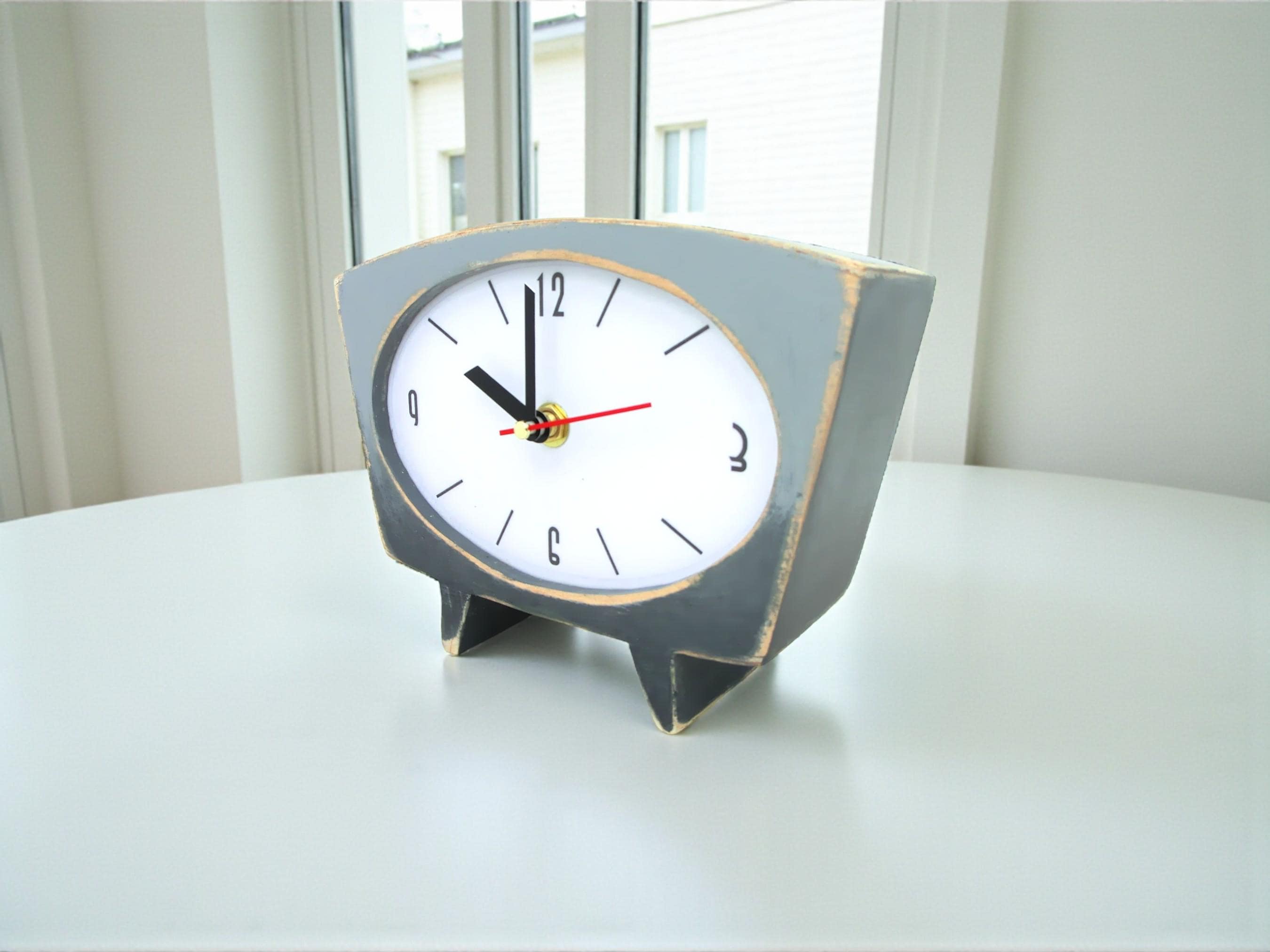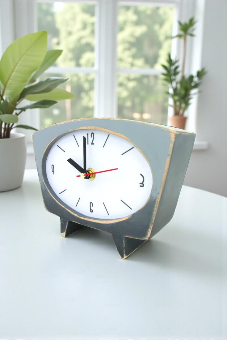 This unique, handcrafted wooden desk clock features a stunning grey ombre finish and distressed detailing, creating a vintage, farmhouse aesthetic that complements any interior. This beautiful timepiece is perfect for adding warmth and character to your living room, bedroom, or office.