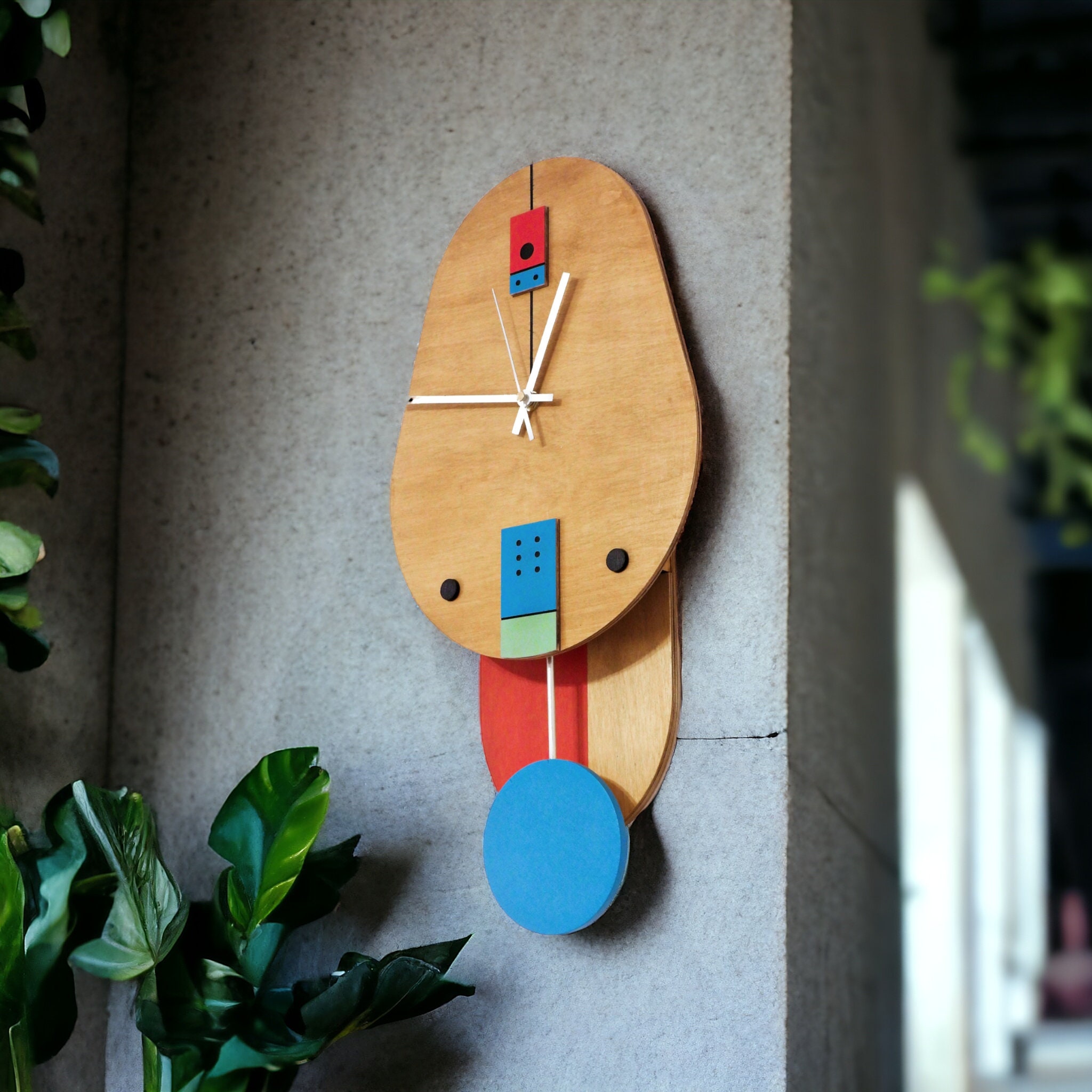 This unique geometric pendulum wall clock brings a modern artistic touch to any room. Handcrafted from wood and plywood with acrylic paint, it features vibrant mint, turquoise, and red colors that create a lively accent. The silent mechanism ensures a calm and peaceful environment, perfect for living rooms, offices, or studios.