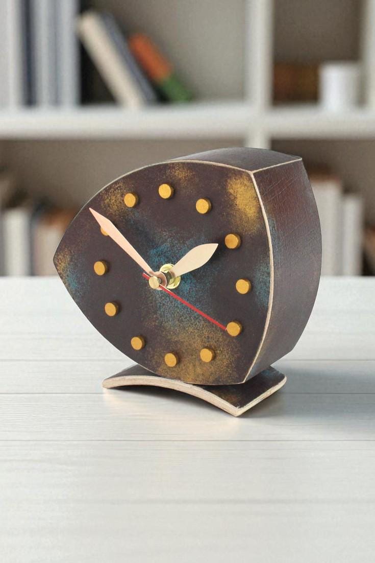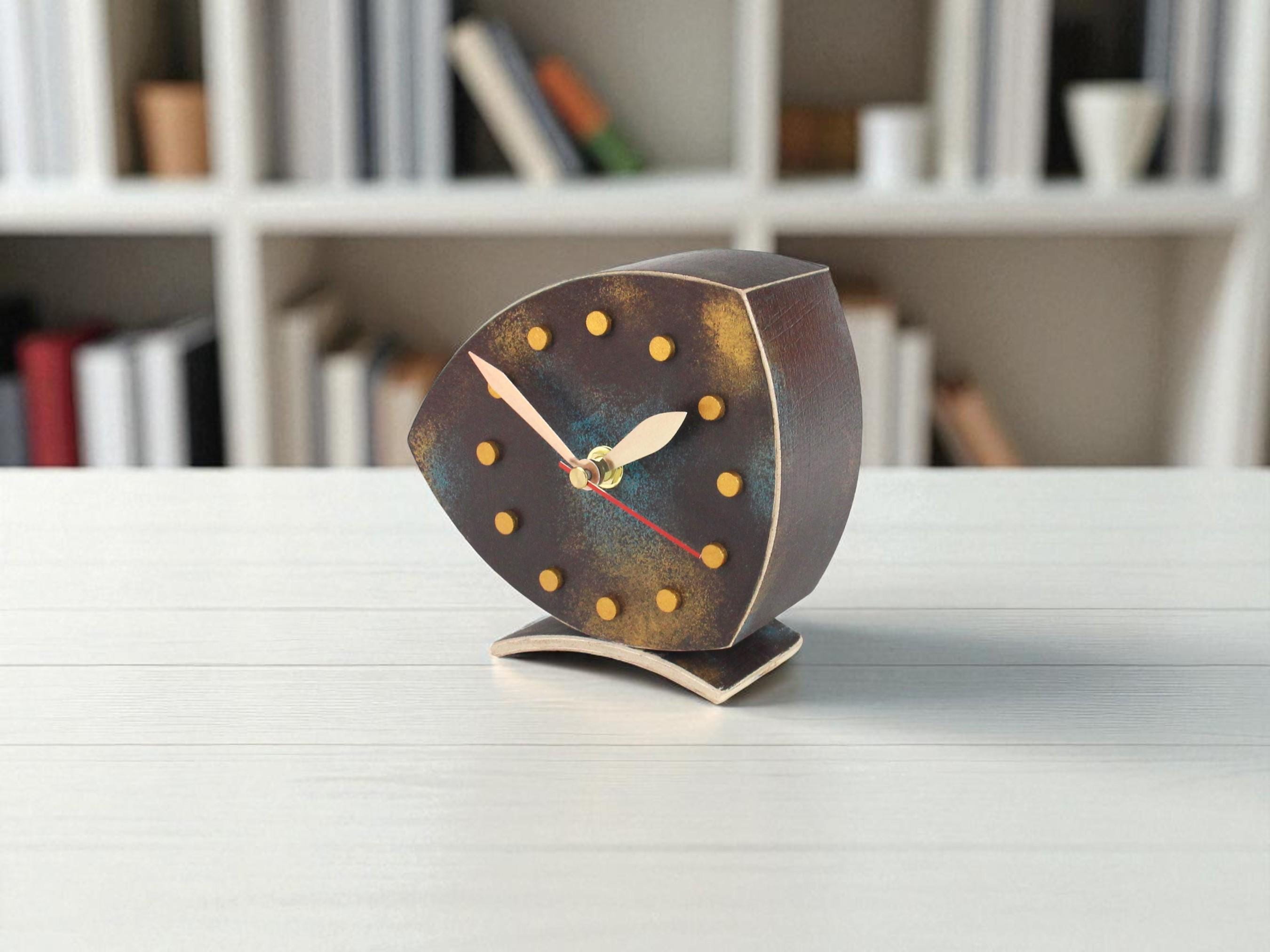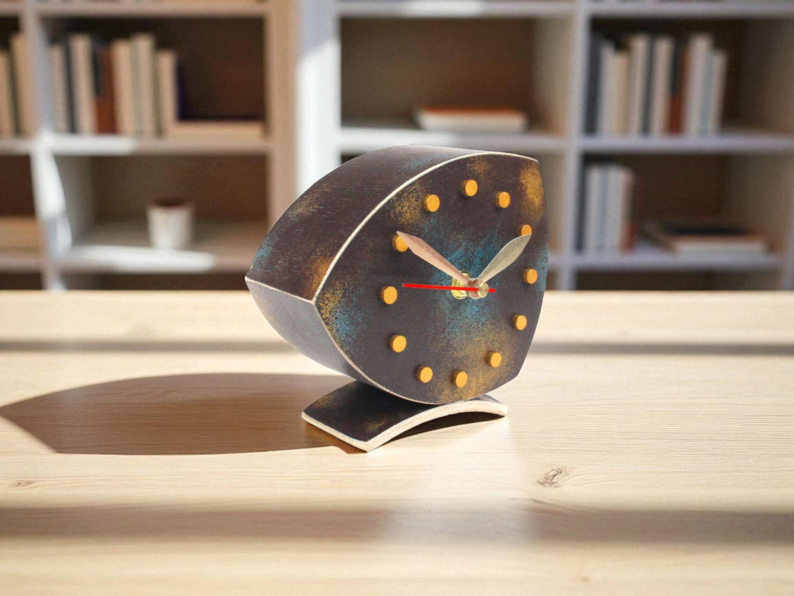 Handmade wooden desk clock in gold and turquoise patina tones, featuring an asymmetrical modern form and a silent quartz mechanism, perfect for a desk, shelf, or mantel decor. Its sculptural shape and vintage inspired finish create a distinctive decorative accent suitable for both modern and classic interiors.