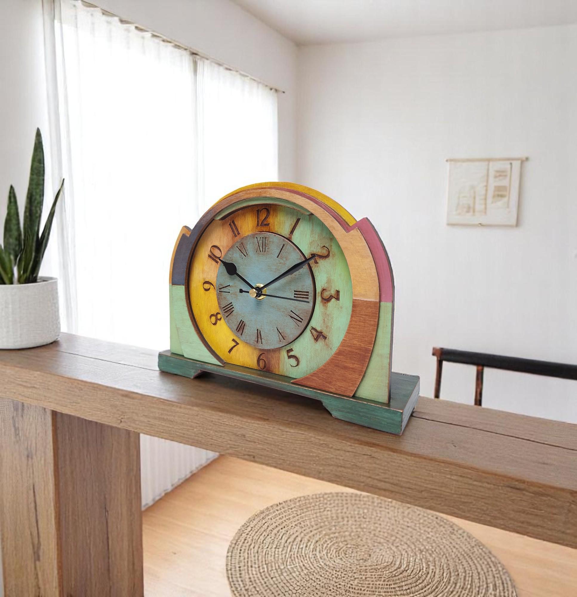 Vintage style wooden clock by Artma Studio. This beautifully handcrafted table clock features a distressed design in rich colors of mahogany, yellow, brown, blue, and mint green, adding a rustic touch to any interior. Perfect for a desk, mantelpiece, or shelf, this unique wooden clock is not only a functional timepiece but also a delightful decorative element.