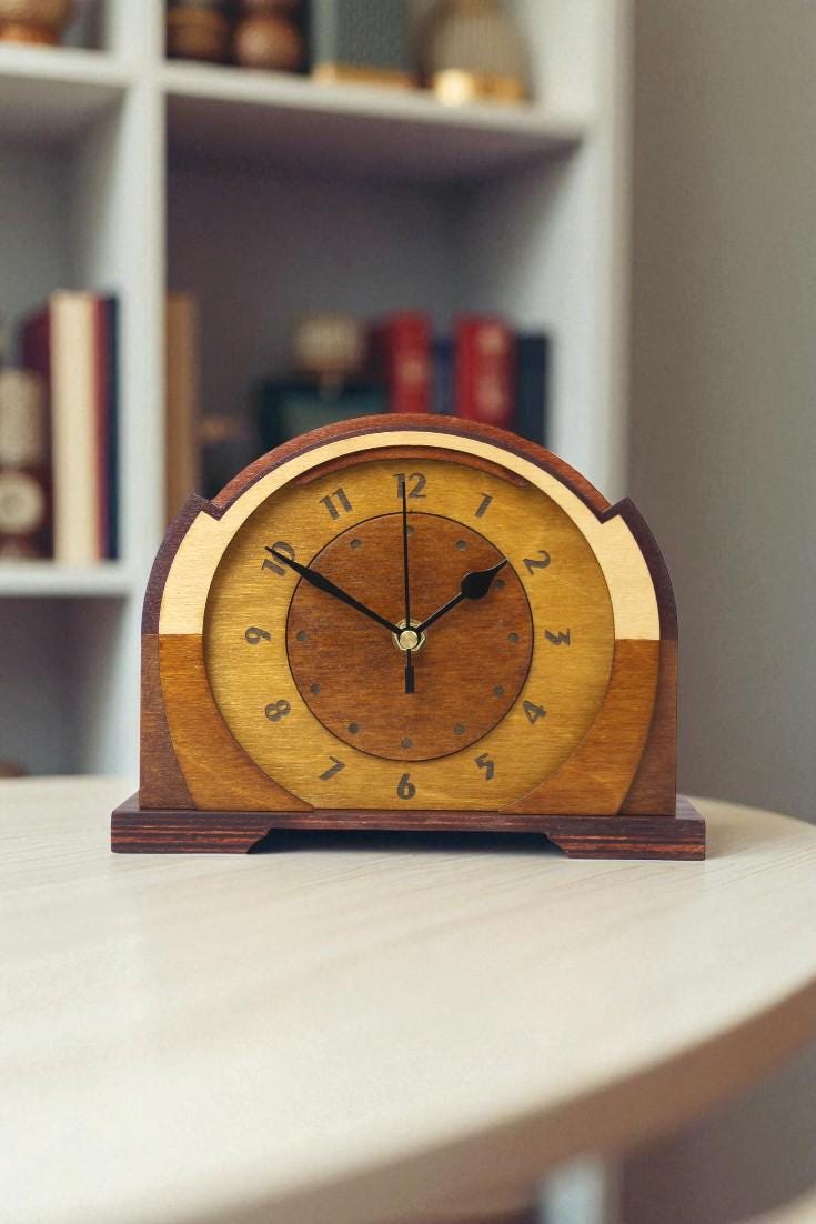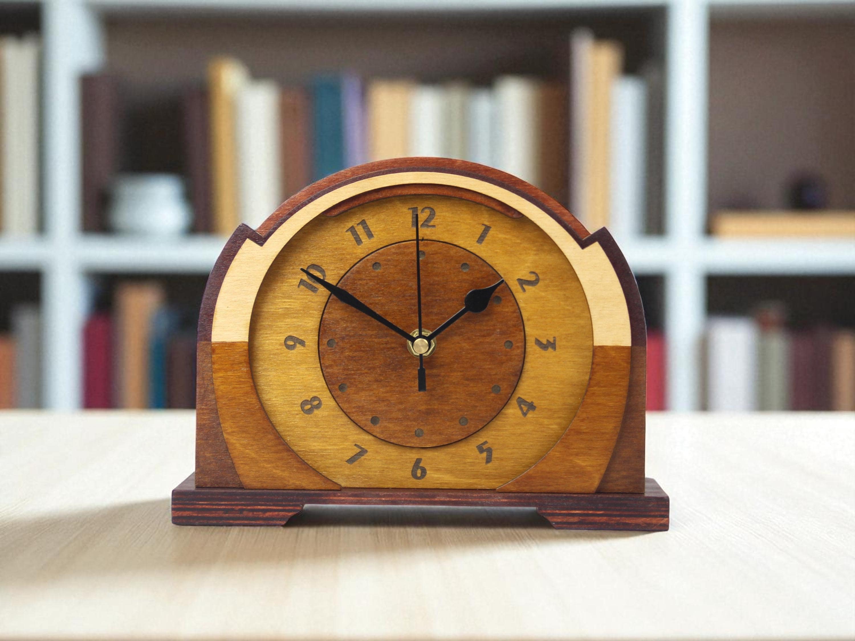 Discover a beautifully handcrafted wooden mantel clock inspired by the timeless elegance of Art Deco and the clean, modern lines of Mid-Century Modern design. Warm tones of ochre and mahogany, layered wood construction and a smooth hand-polished finish make this clock much more than a timepiece - it is a striking decorative accent with refined retro character.