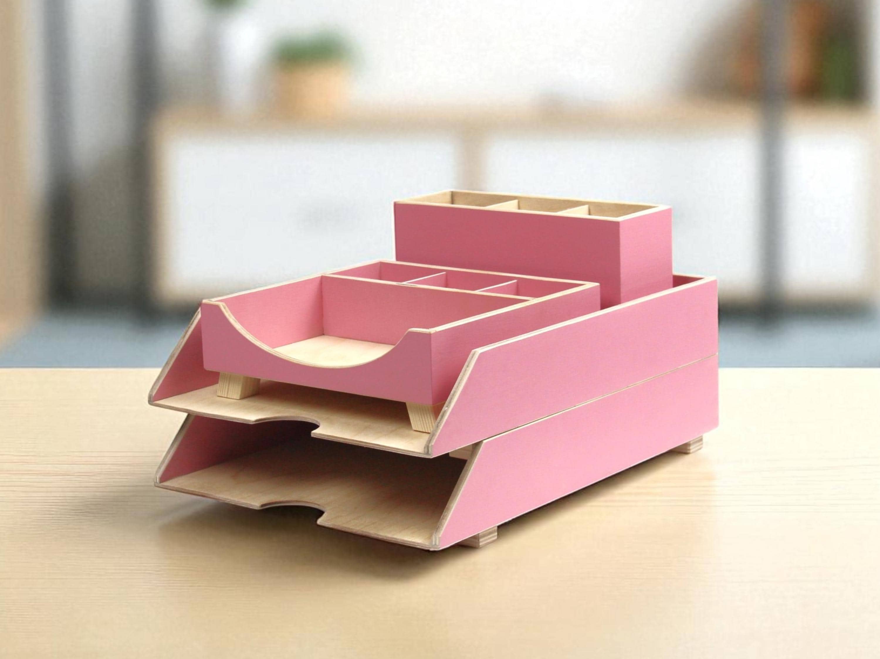 This wooden desk organizer with stackable trays is designed to keep your workspace tidy and stylish. Painted in soft pink and handcrafted from durable plywood, it includes a paper tray, compartments for pens, and boxes for small essentials. Perfect for office, home office, or study desk, this organizer combines function with modern design.
