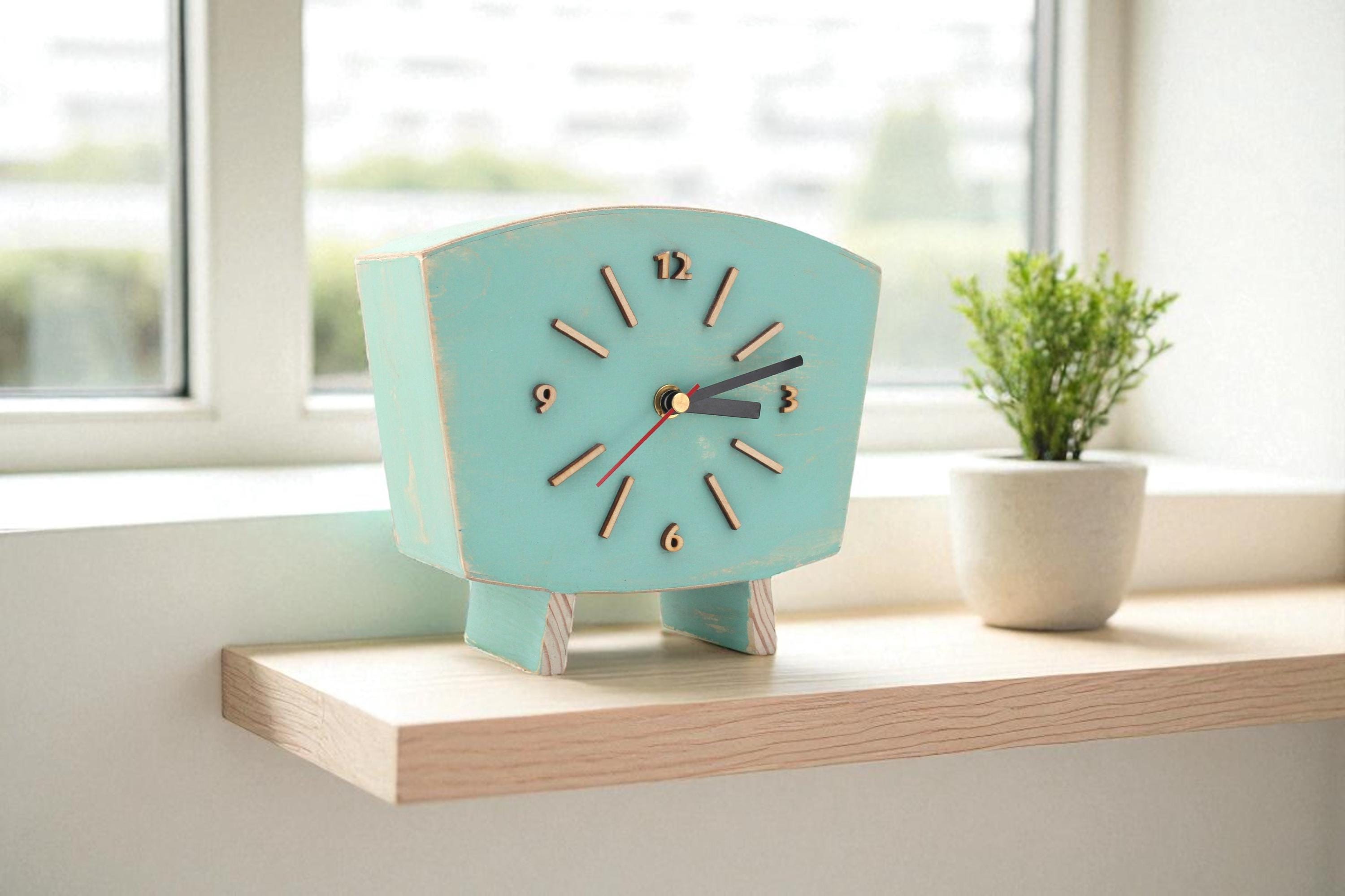 This Mint Green Wooden Desk Clock adds shabby chic charm to any room. Crafted from high-quality plywood and hand-painted with acrylic paints, it is finished with an eco-friendly varnish for durability and elegance. The vibrant mint green color brightens desks, shelves, or mantelpieces, making it a perfect decorative accent.