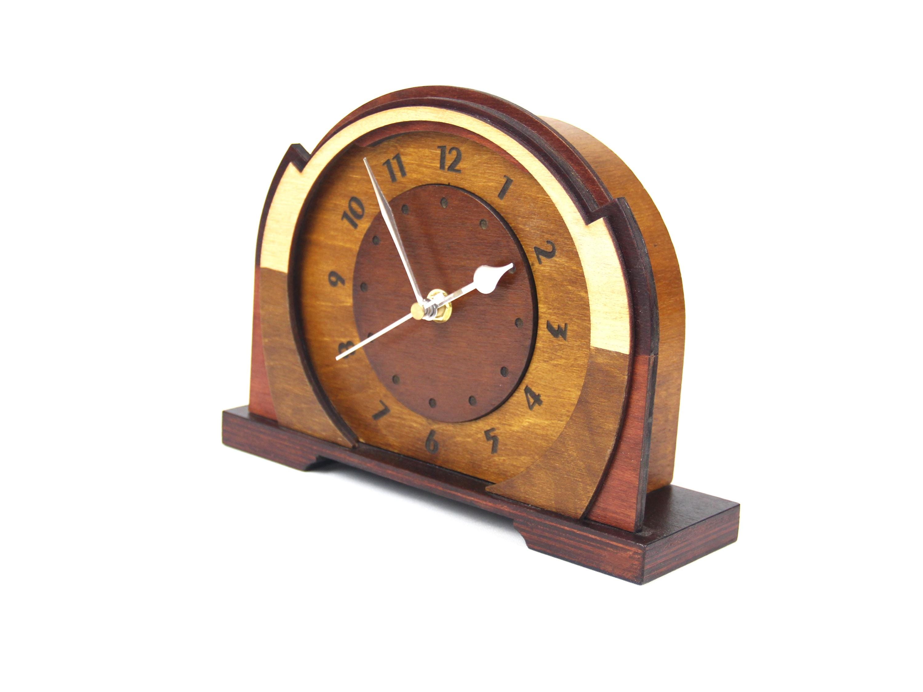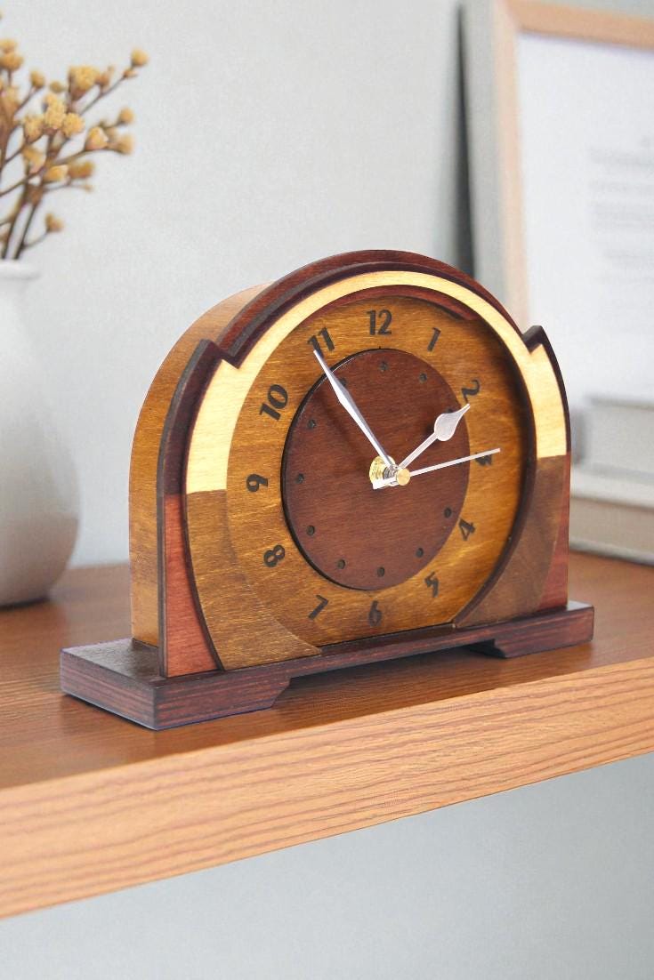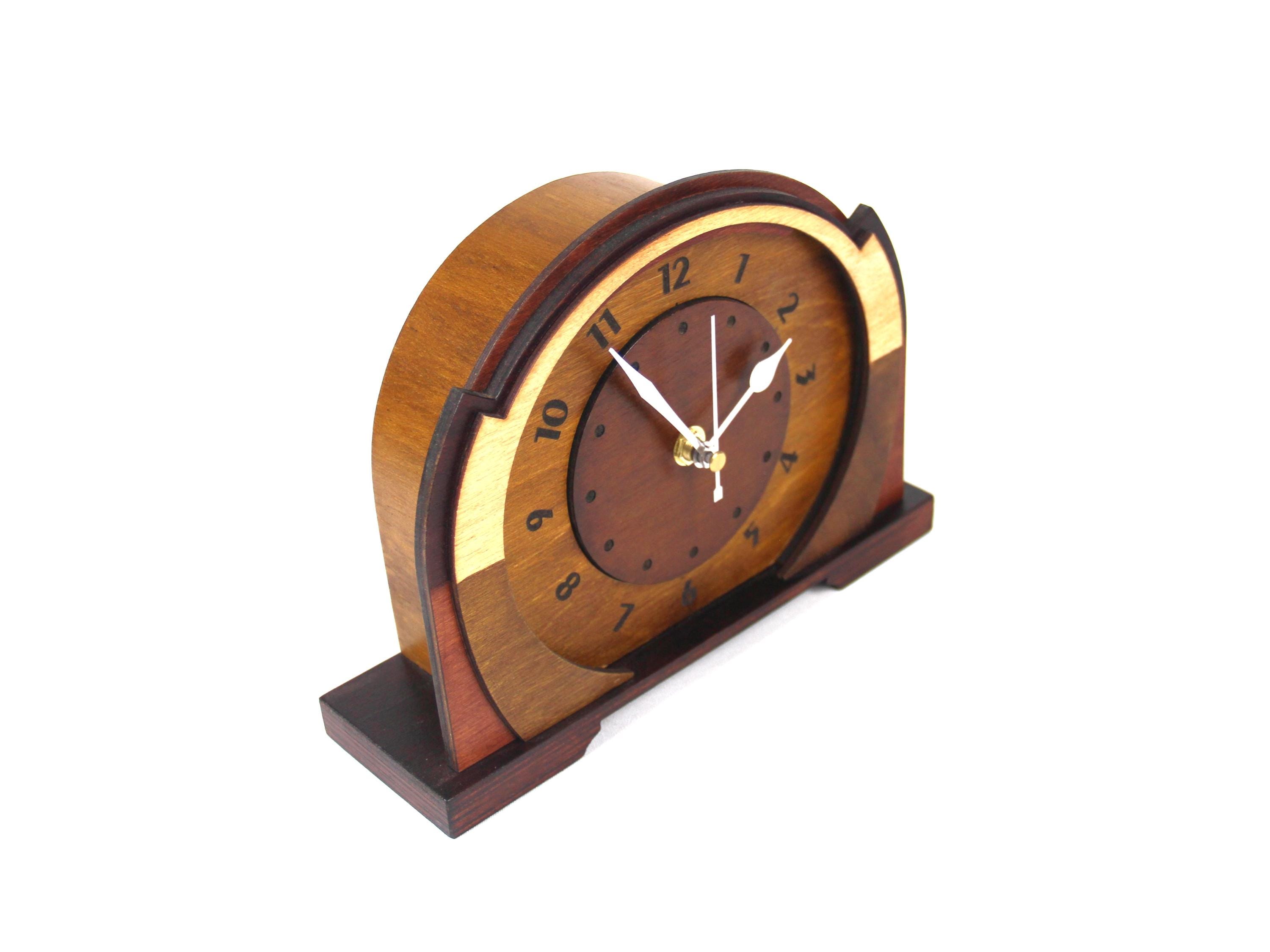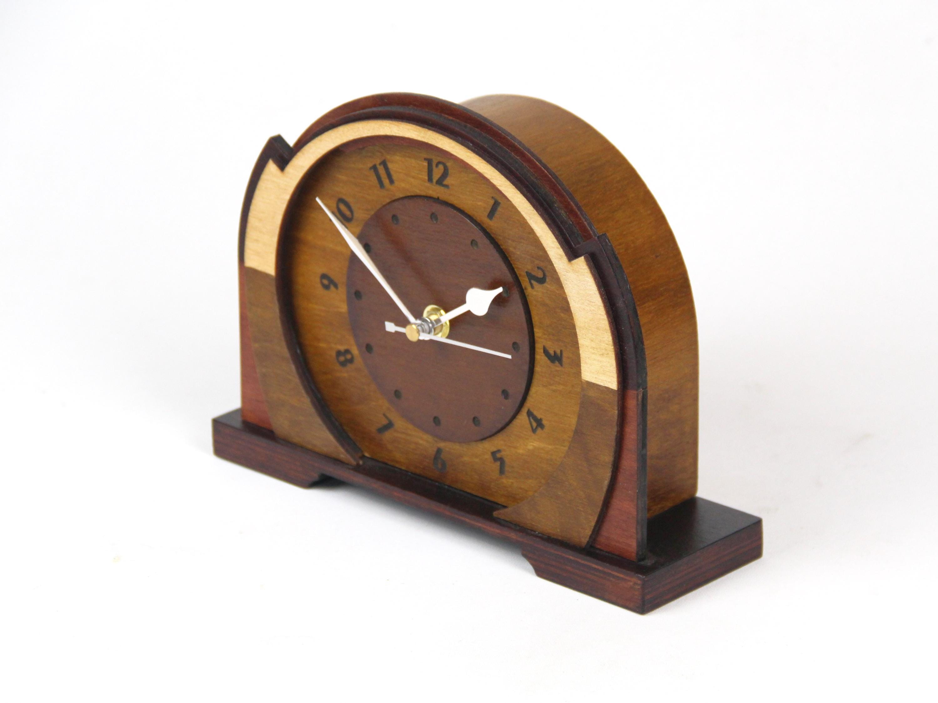 This exquisite Art Deco Wooden Mantel Clock features the characteristic geometric and streamlined design of the 1920s and 30s. Handcrafted from contrasting layers of natural woods (Mahogany, Walnut, and Light Oak colors), it perfectly blends the rich symmetry of Art Deco with the organic functionality of Mid-Century Modern (MCM) design. This unique clock is a sophisticated piece of functional art for your desk or fireplace, and the perfect Handmade Xmas Gift for a design enthusiast.