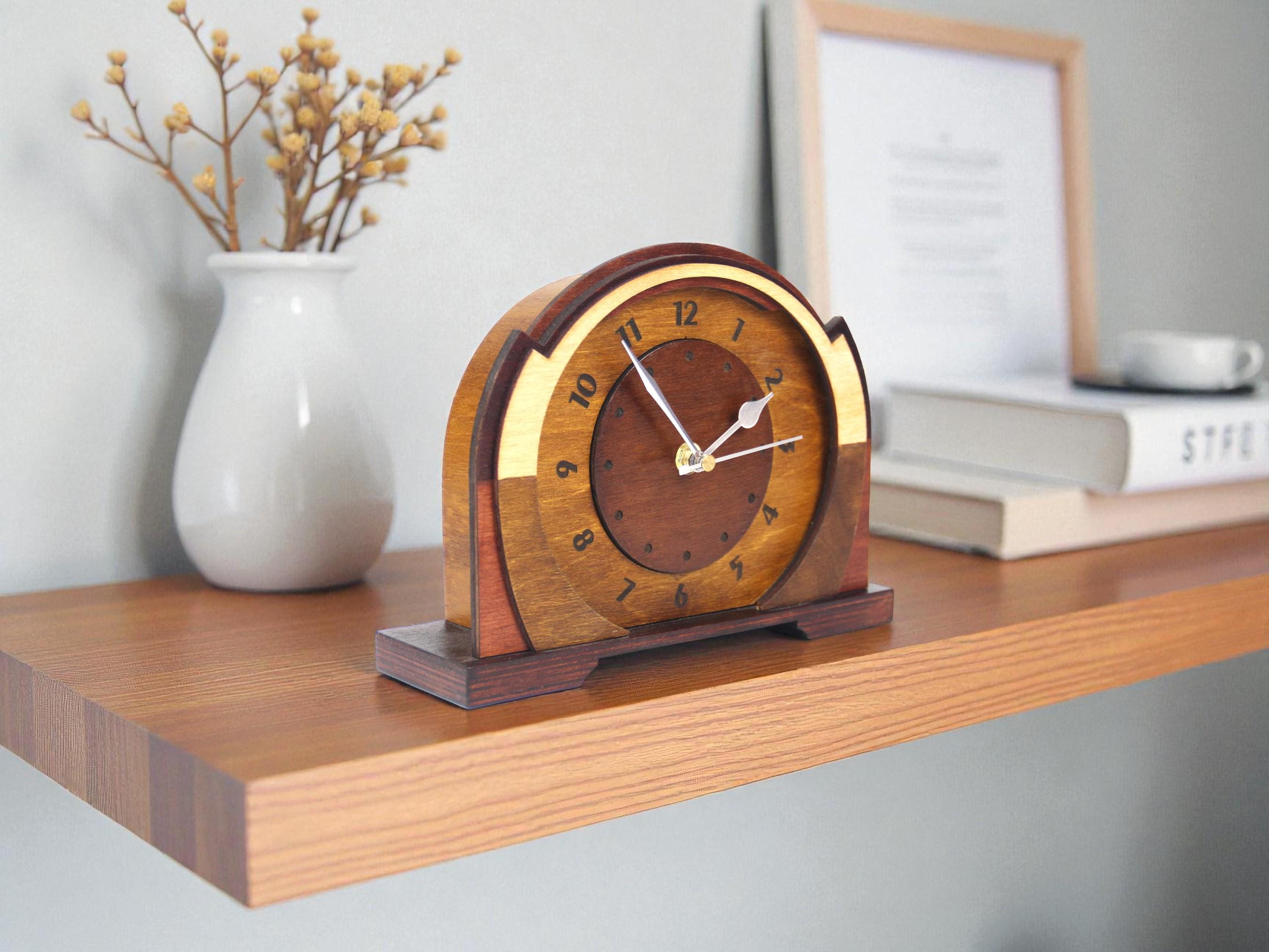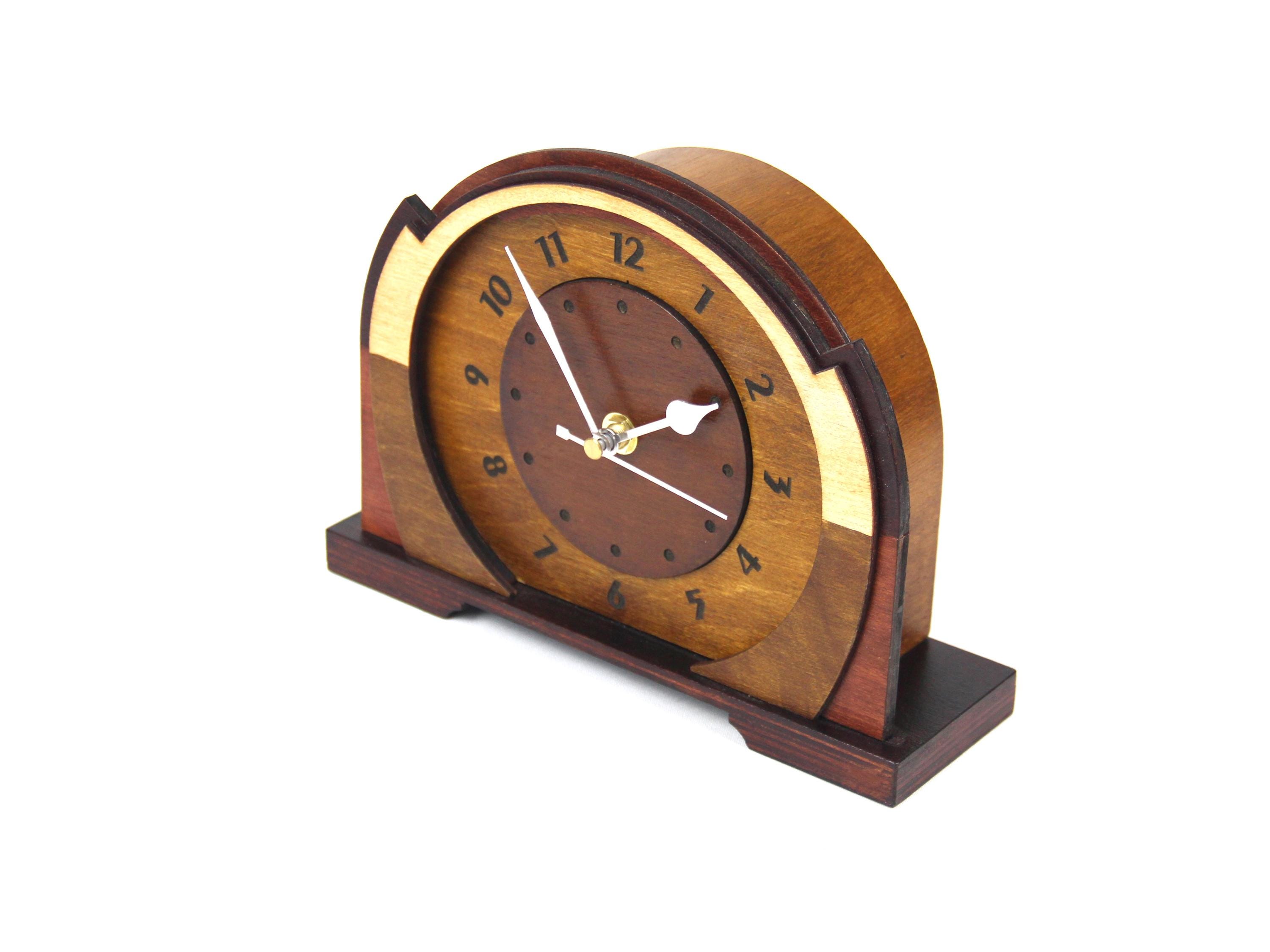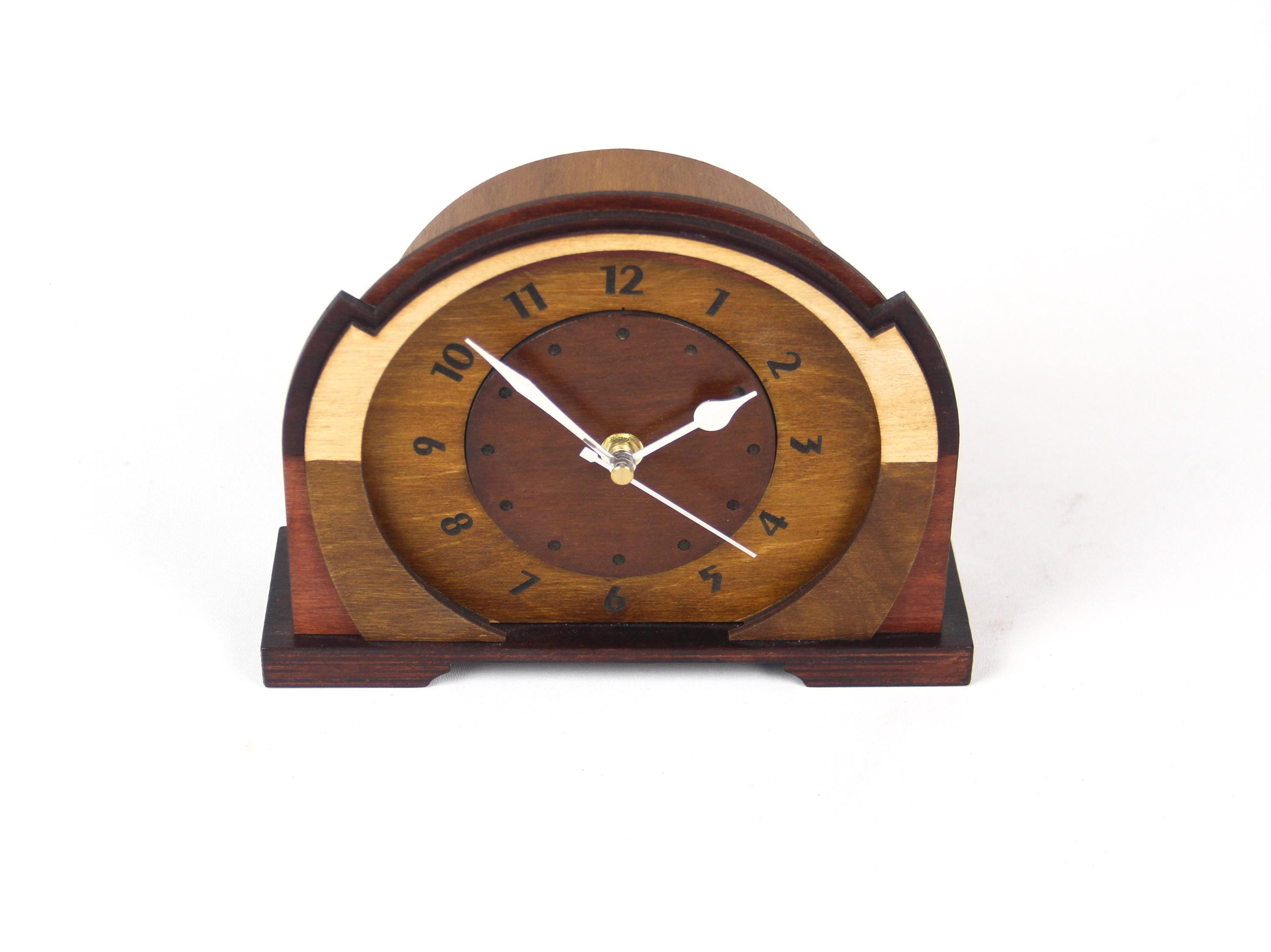 This exquisite Art Deco Wooden Mantel Clock features the characteristic geometric and streamlined design of the 1920s and 30s. Handcrafted from contrasting layers of natural woods (Mahogany, Walnut, and Light Oak colors), it perfectly blends the rich symmetry of Art Deco with the organic functionality of Mid-Century Modern (MCM) design. This unique clock is a sophisticated piece of functional art for your desk or fireplace, and the perfect Handmade Xmas Gift for a design enthusiast.