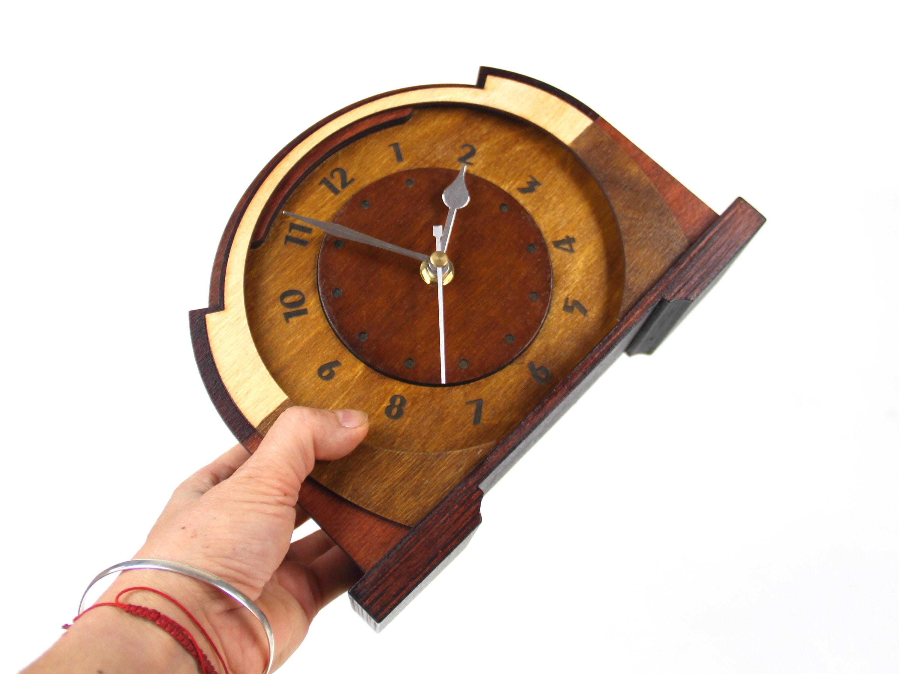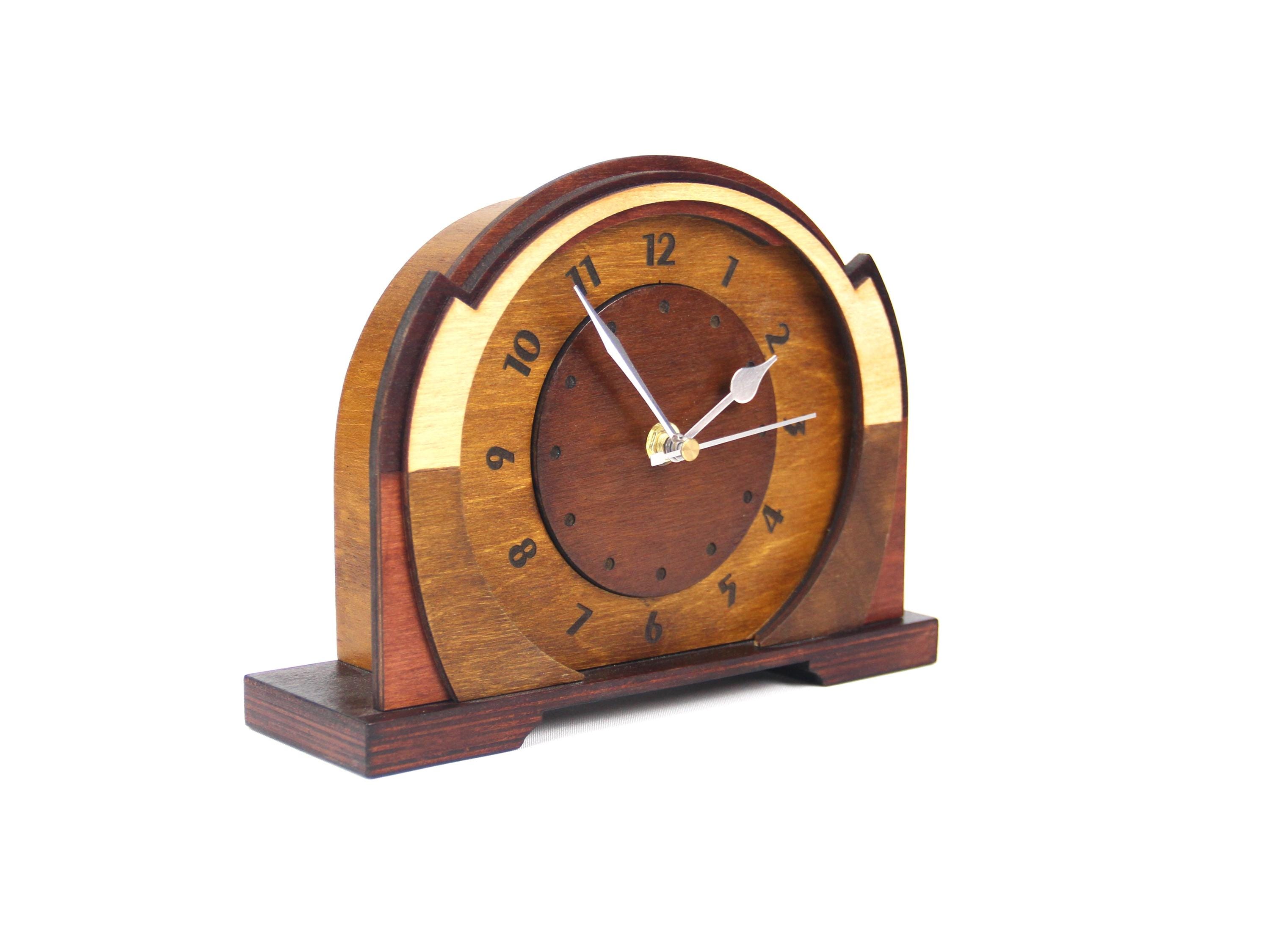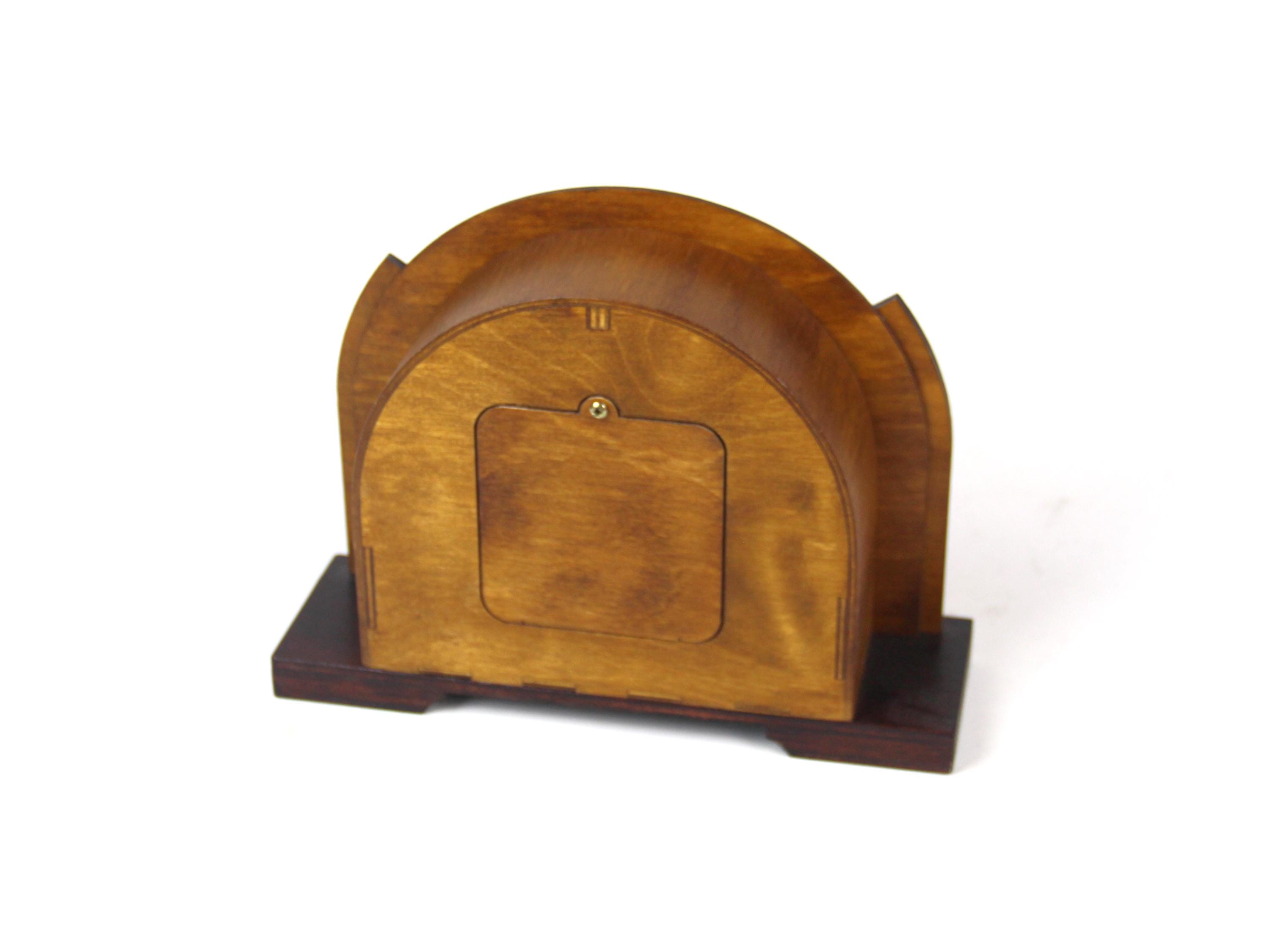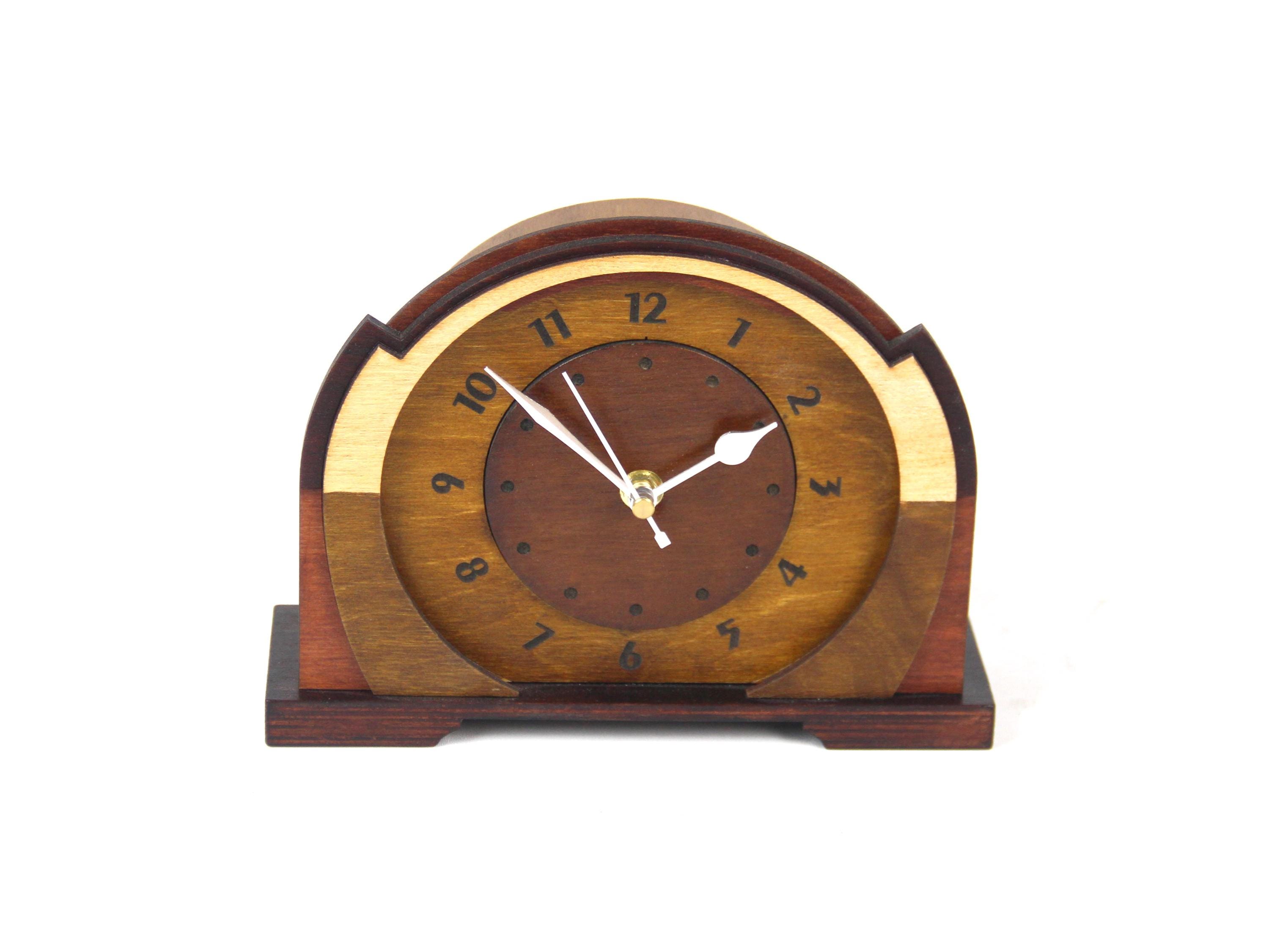 This exquisite Art Deco Wooden Mantel Clock features the characteristic geometric and streamlined design of the 1920s and 30s. Handcrafted from contrasting layers of natural woods (Mahogany, Walnut, and Light Oak colors), it perfectly blends the rich symmetry of Art Deco with the organic functionality of Mid-Century Modern (MCM) design. This unique clock is a sophisticated piece of functional art for your desk or fireplace, and the perfect Handmade Xmas Gift for a design enthusiast.