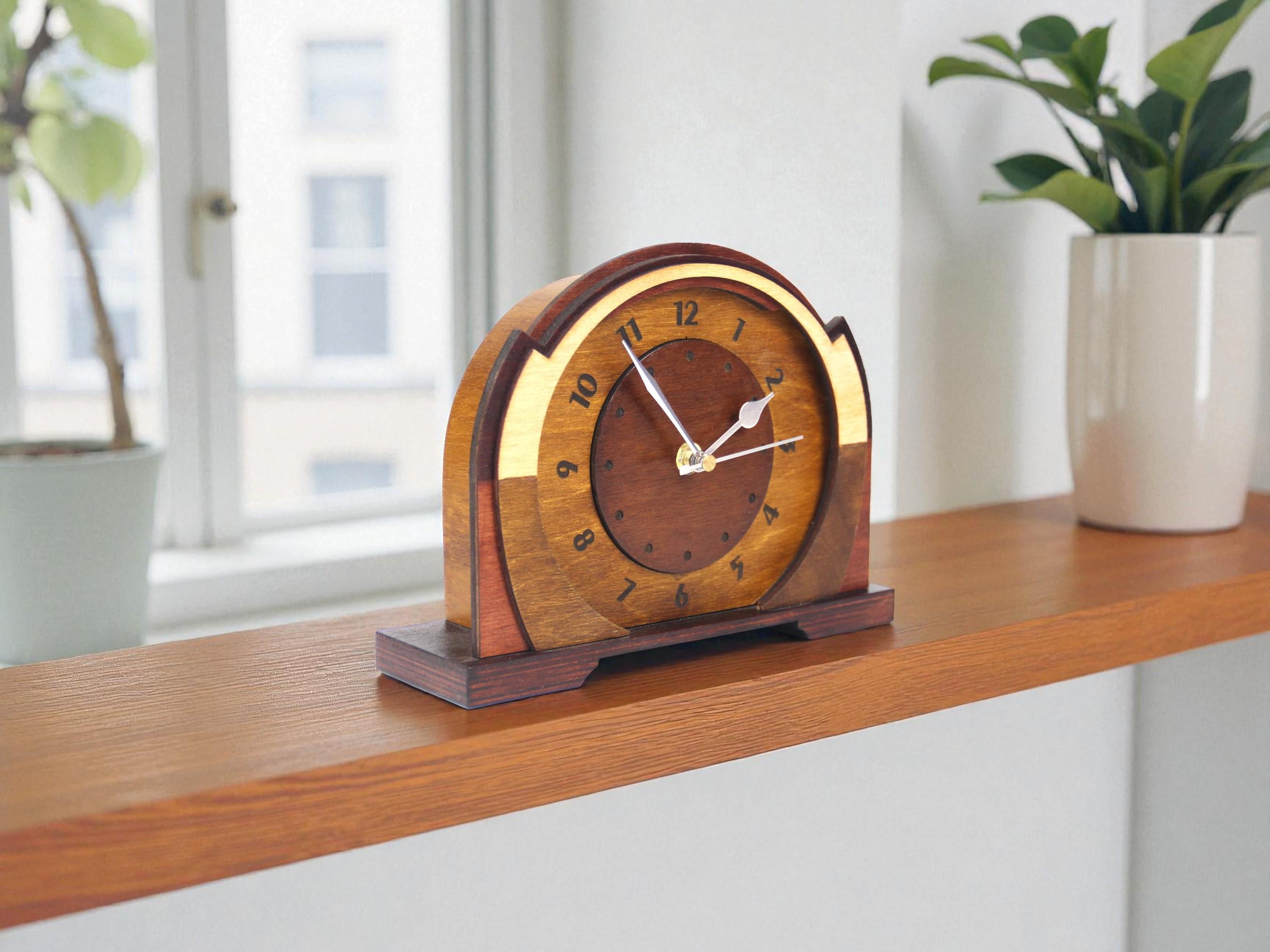 Style: Art Deco / Mid-Century Hybrid – Material: Layered Wood (Mahogany, Walnut, Light Oak) – Finish: Hand-sanded and oiled – Movement: Silent Quartz mechanism (No ticking sound) – Dimensions: [Wymiary, np.: H 18cm x W 25cm x D 7cm]