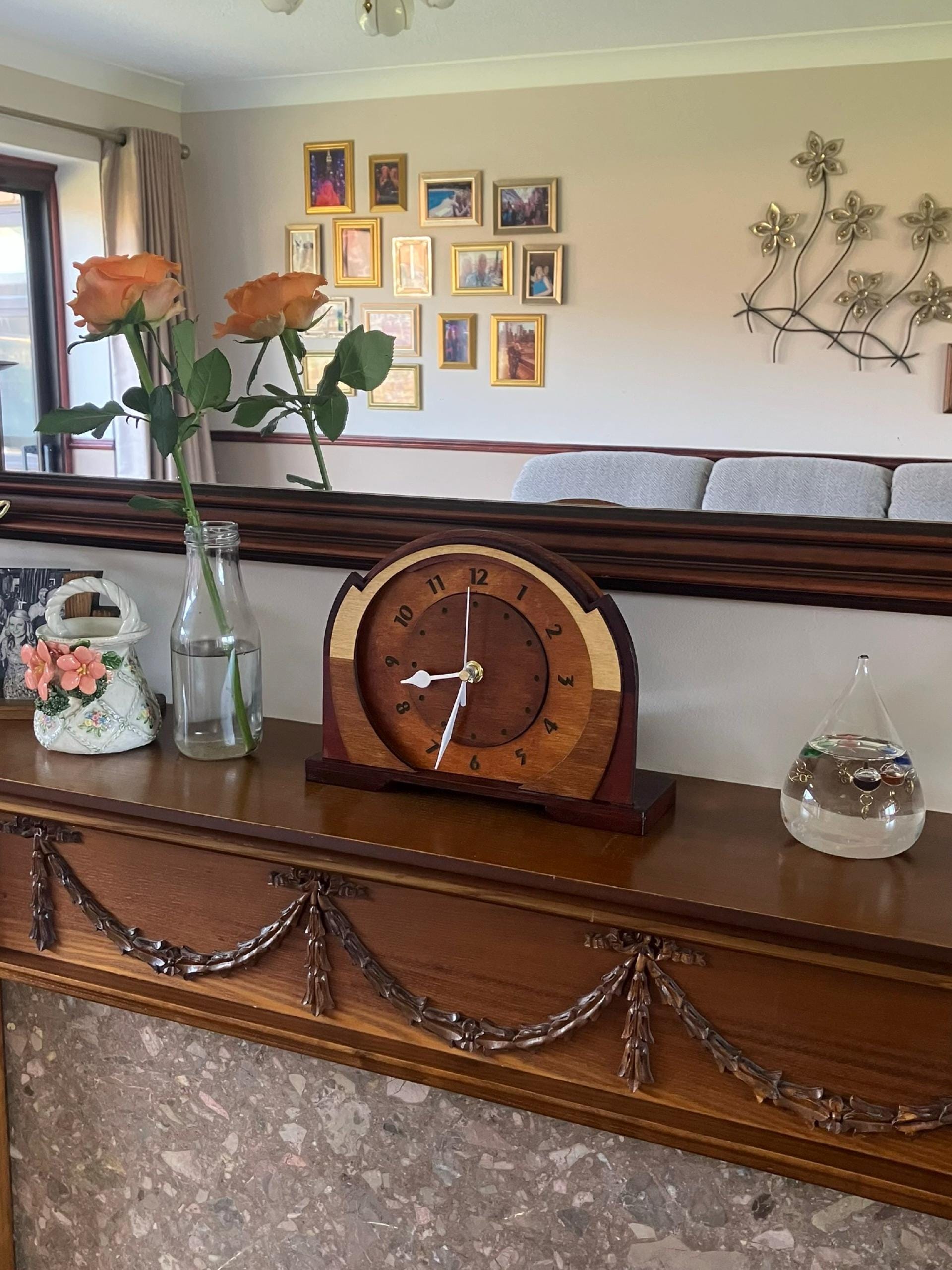 This handmade wooden mantel clock is inspired by the elegant geometry and refined proportions of Art Deco design from the 1920s and 1930s. Its clean lines and balanced silhouette make it a sophisticated decorative accent for a desk, shelf or mantelpiece.