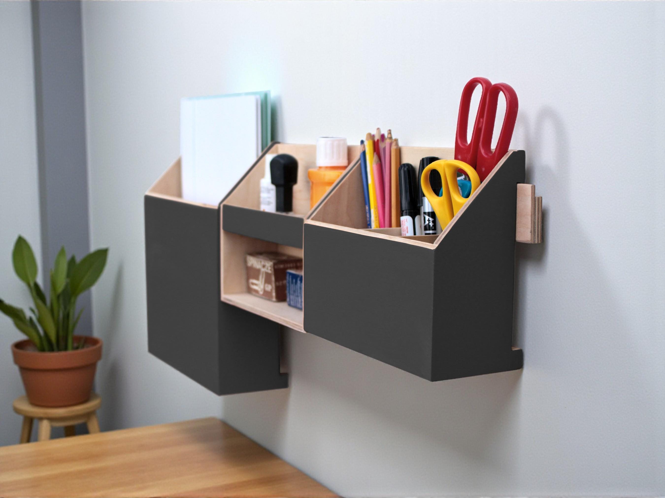 This hanging black wooden organizer is a functional solution for storing small objects, papers, and mail. Keep your desk clean with dedicated spaces for pens, drawing tools, documents, or envelopes.