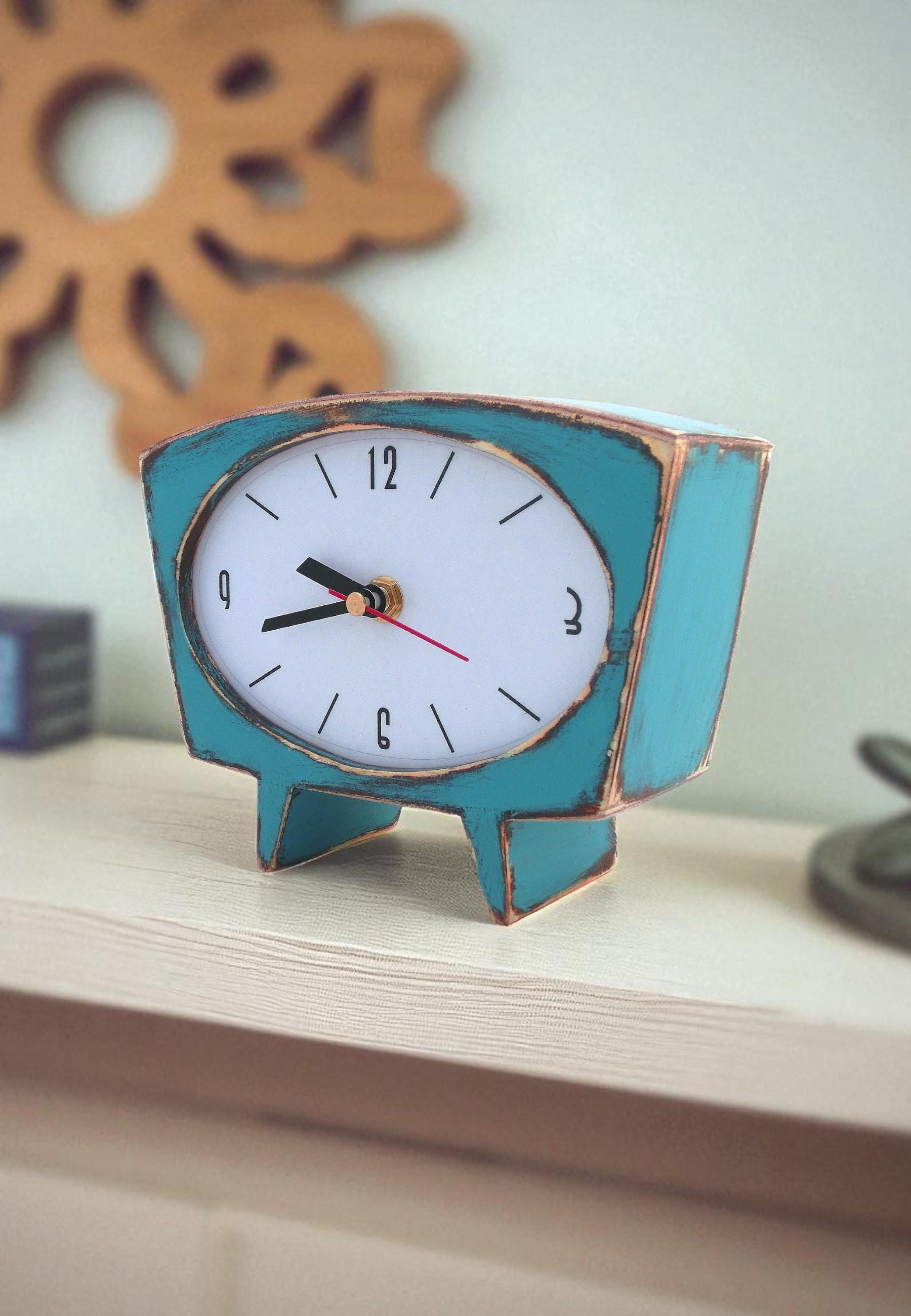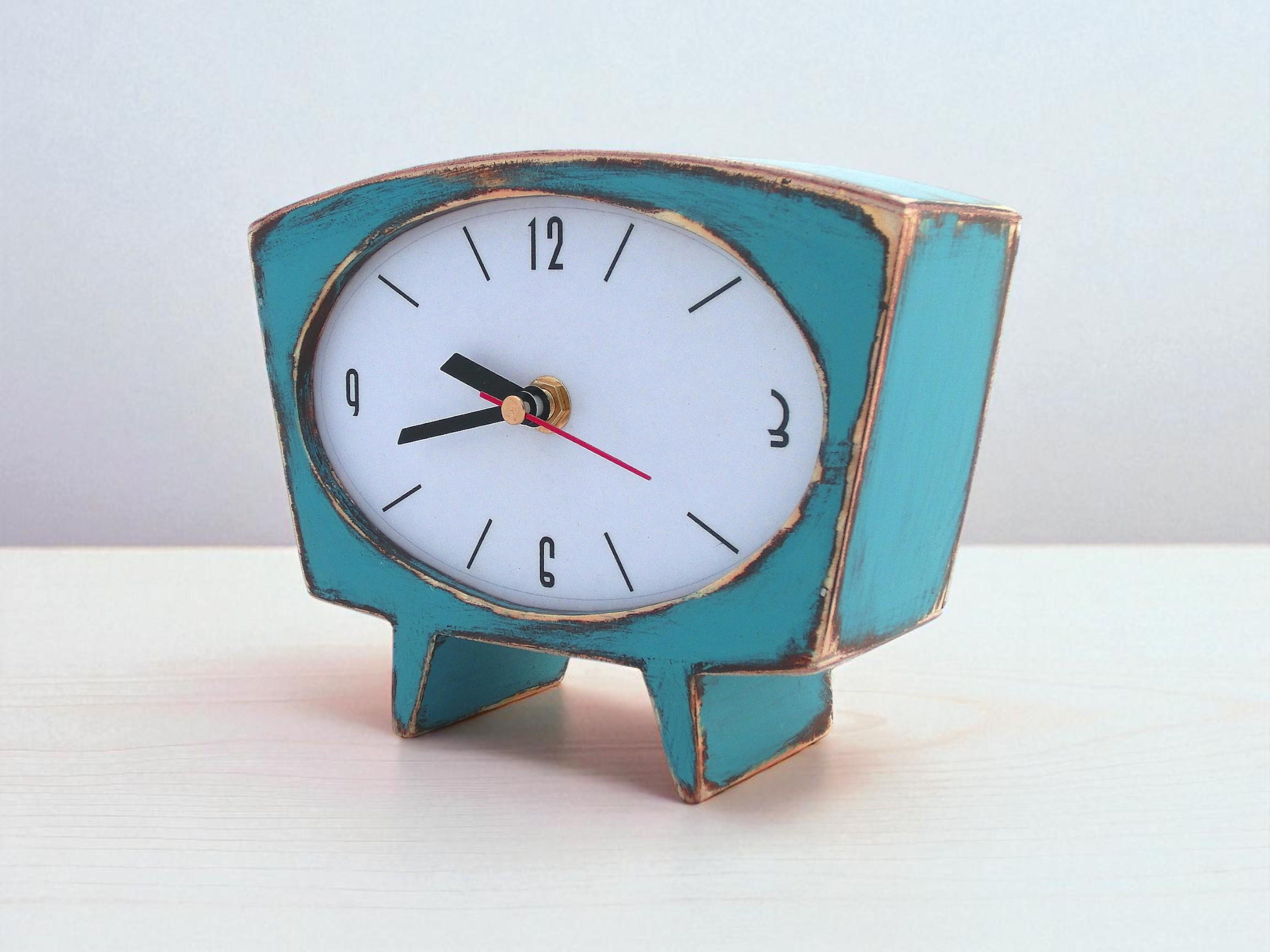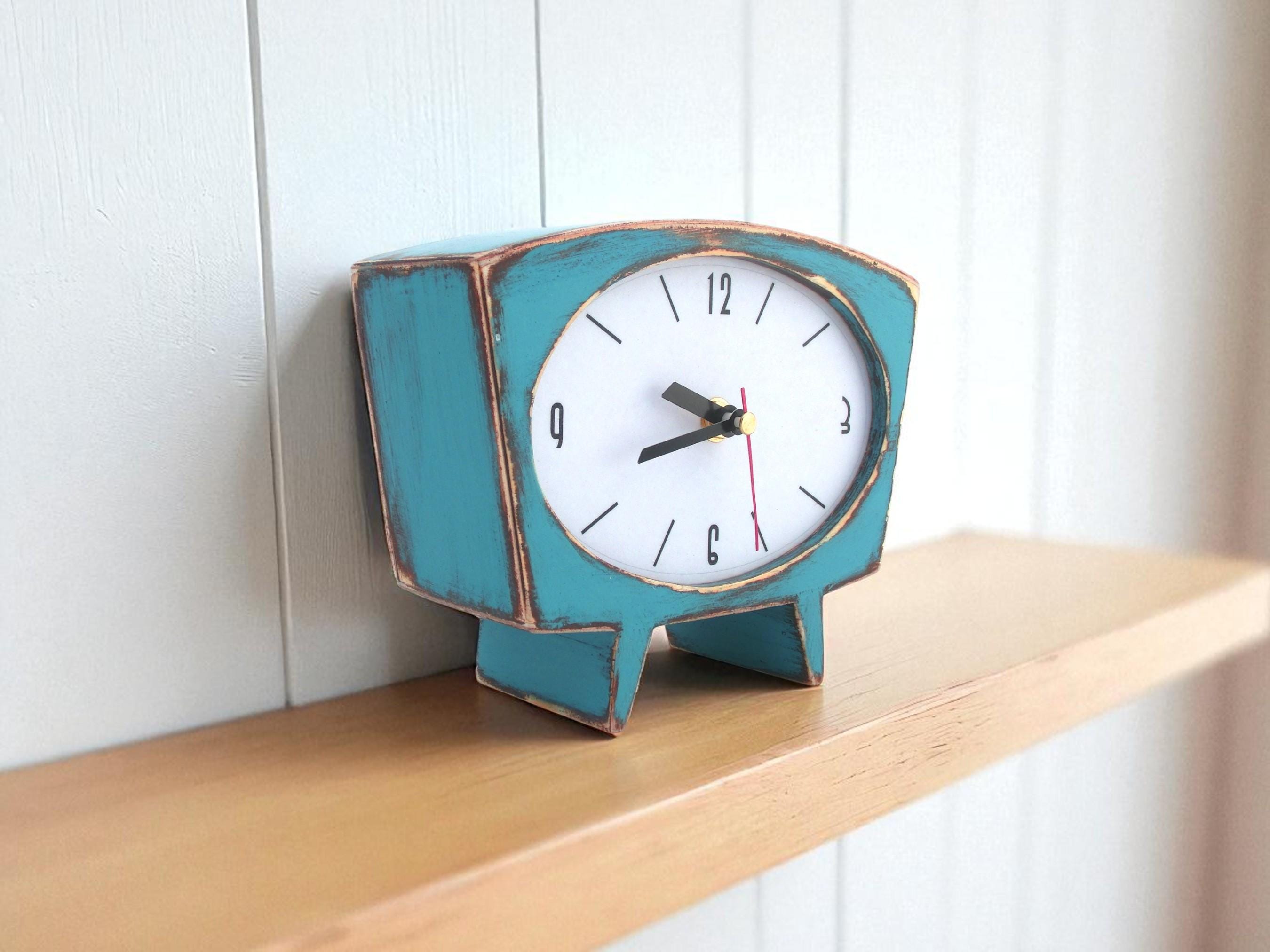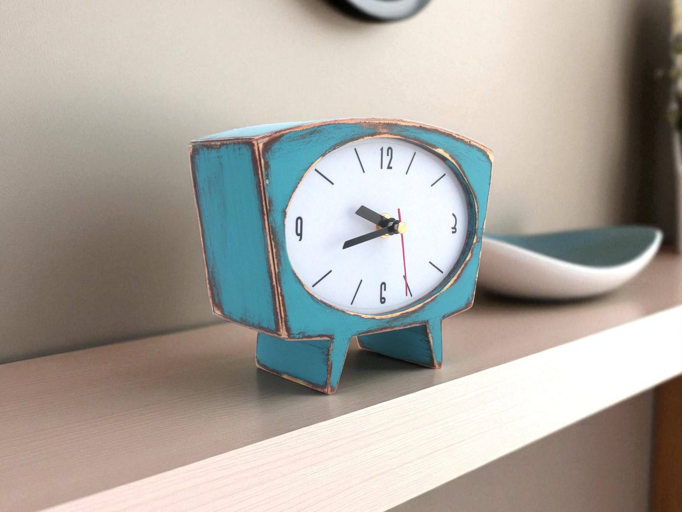 This turquoise blue wooden desk clock is a charming and eco-friendly addition to any office or home space. Handmade from solid wood and plywood, it features a 60s vintage style with non-toxic acrylic hand-painted finishes, sealed with an ecological varnish for lasting beauty.