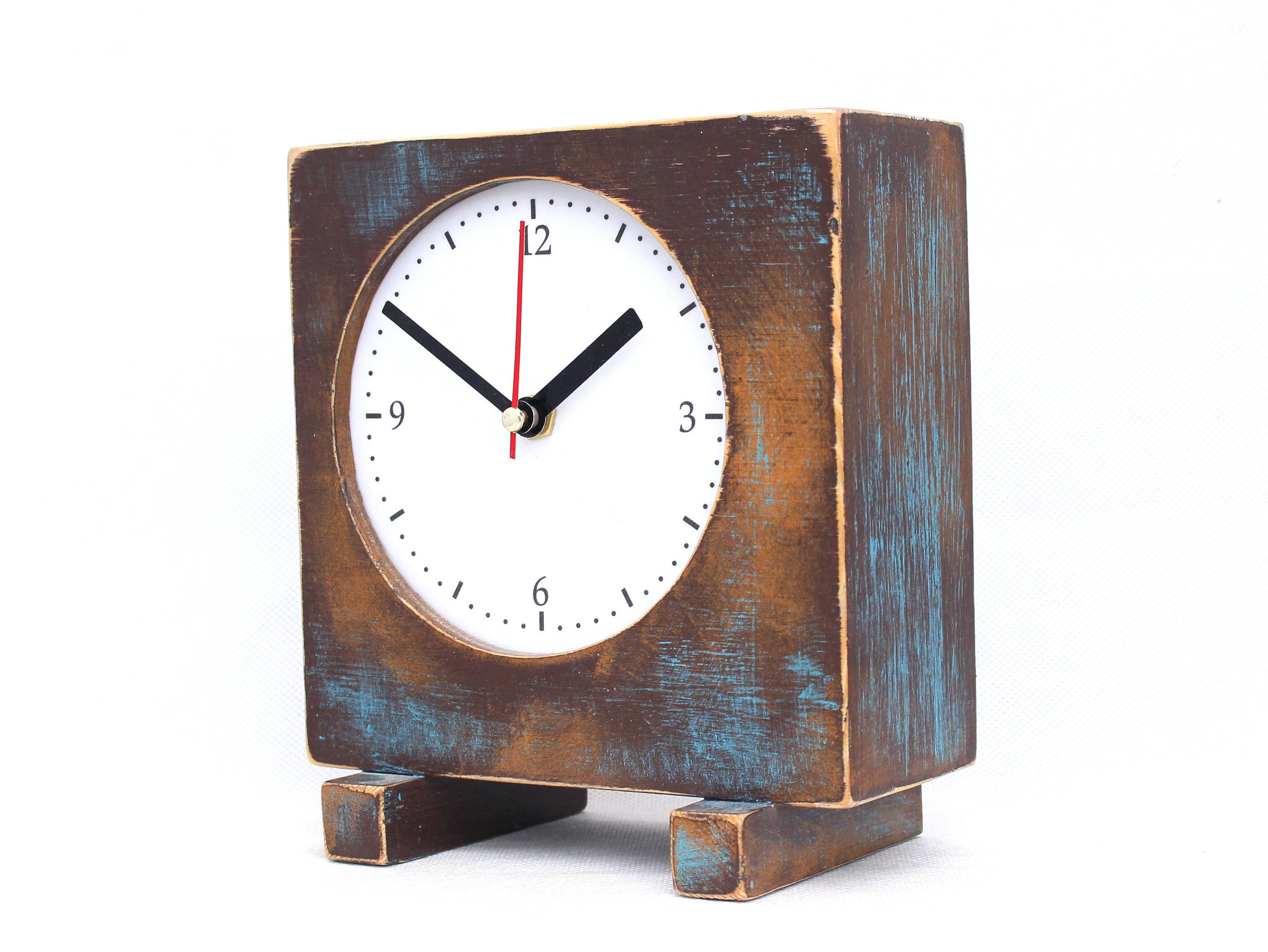Desk Clock Brown Gold Turquoise, Wooden Table Clock, Unique Square Wood Clock, Wooden Shaded clock, Winter decor