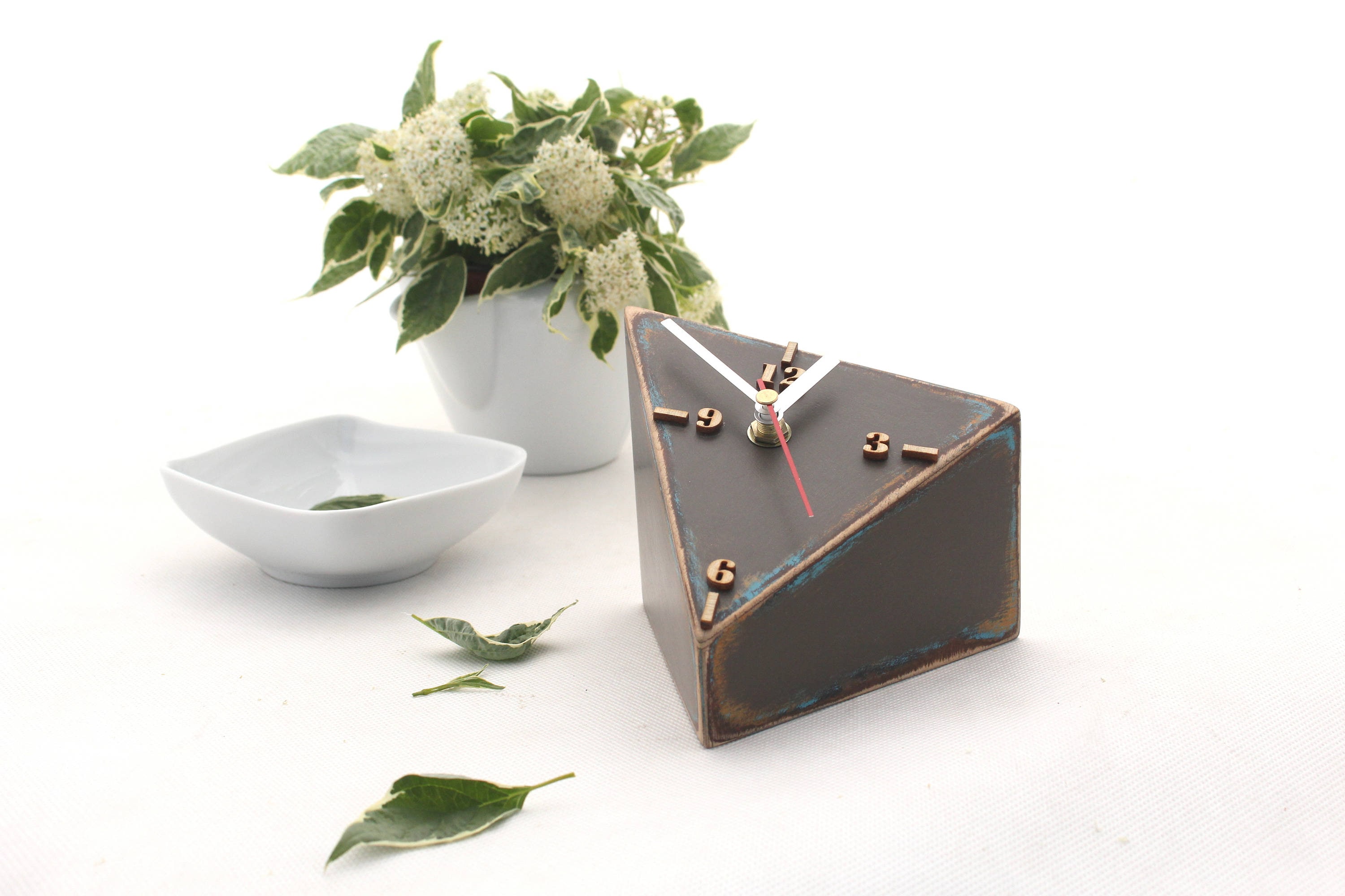Chistmas gift, Black Friday sale, , Wood Desk Clock Brown Grey Turquoise, Triangle Table clock Geometric, Unique gift, Birthday gift, Distressed clock, Summer decor for home, Back to school